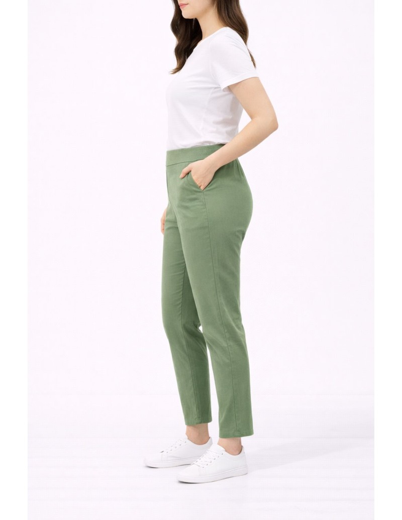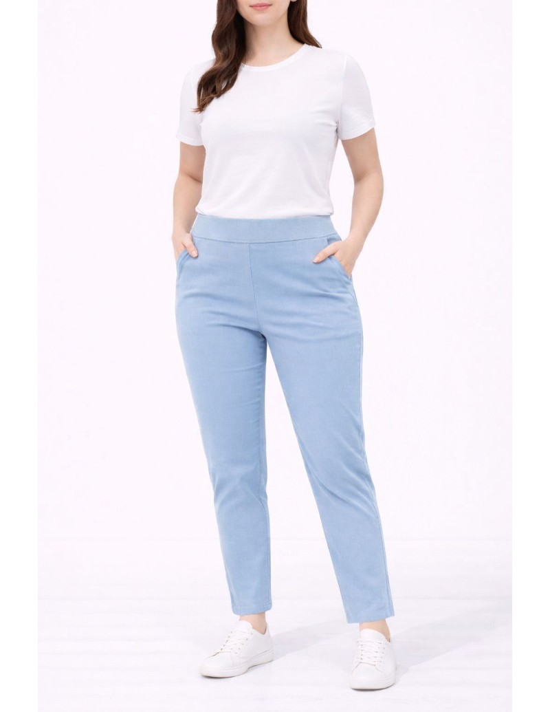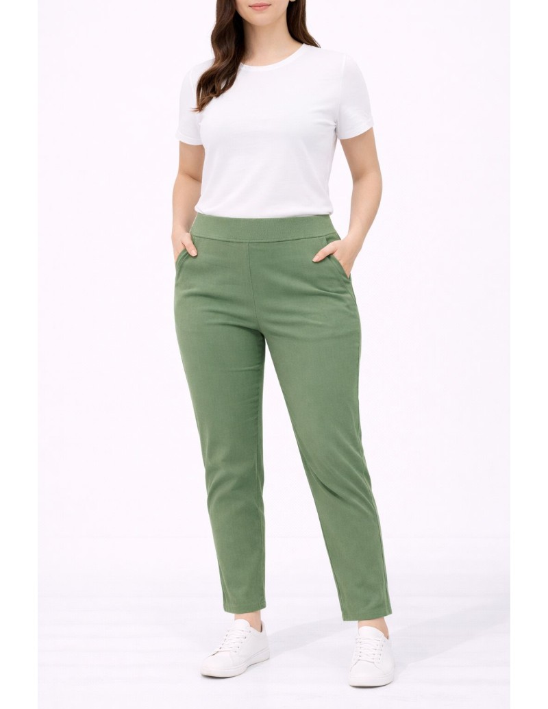 Wygodne spodnie damskie streczowe plus size wykonane z elastycznego i miękkiego materiału, który doskonale dopasowuje się do sylwetki i zapewnia komfort noszenia przez cały dzień. Model posiada gumkę w pasie oraz praktyczne kieszenie, dzięki czemu jest funkcjonalny i idealny do codziennych stylizacji.