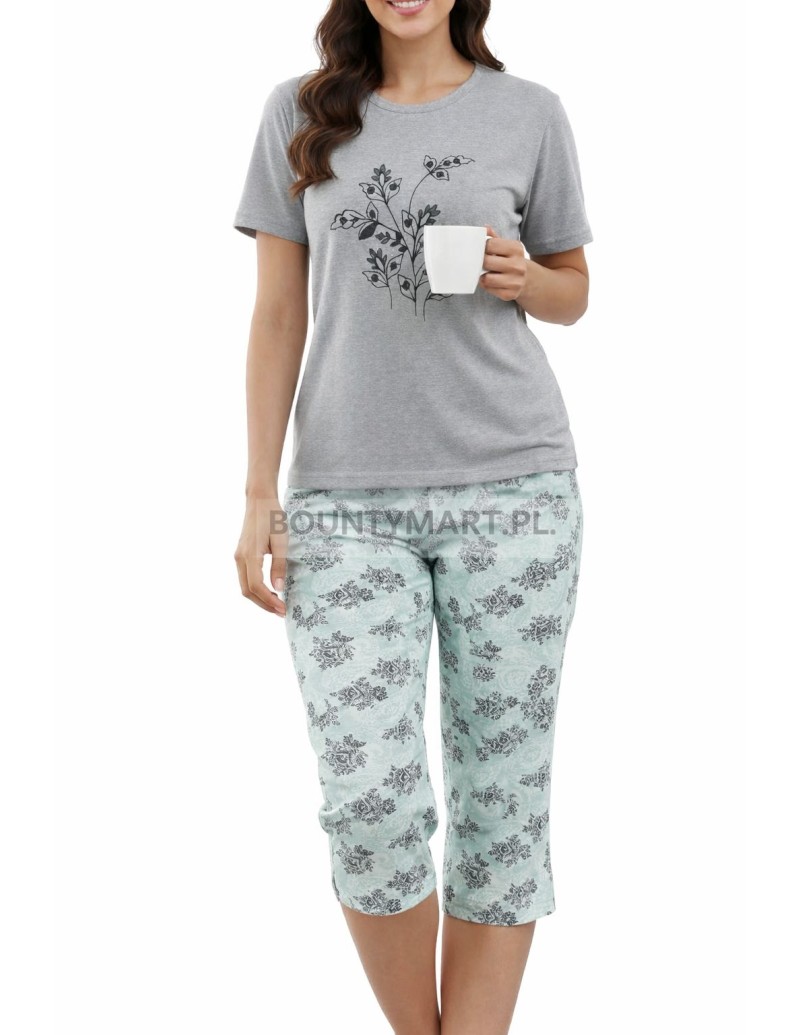 Komfortowa piżama damska wykonana w 100% z wysokiej jakości bawełny. Komplet składa się z koszulki z krótkim rękawem z delikatnym nadrukiem roślinnym oraz spodni o długości 3/4 z modnym wzorem. Materiał jest miękki, oddychający i przyjazny dla skóry, dzięki czemu zapewnia wygodę podczas snu i odpoczynku w domu.