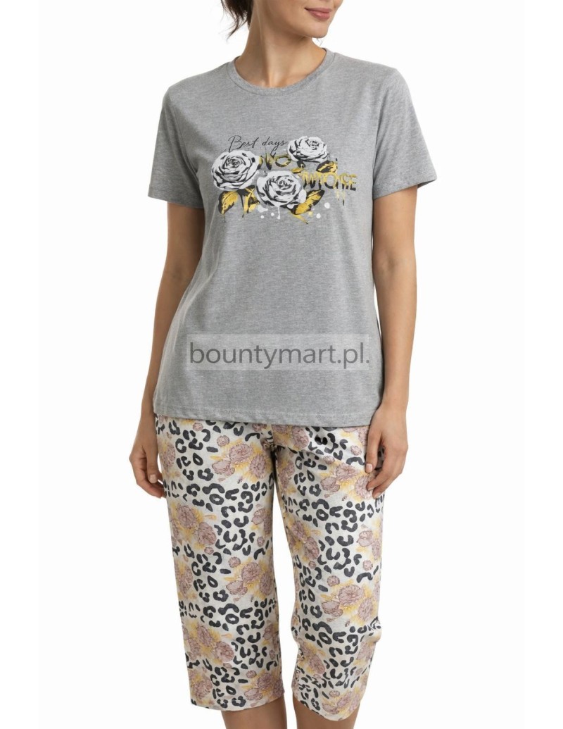 Komfortowa piżama damska wykonana w 100% z wysokiej jakości bawełny. Komplet składa się z koszulki z krótkim rękawem z delikatnym nadrukiem roślinnym oraz spodni o długości 3/4 z modnym wzorem. Materiał jest miękki, oddychający i przyjazny dla skóry, dzięki czemu zapewnia wygodę podczas snu i odpoczynku w domu.
